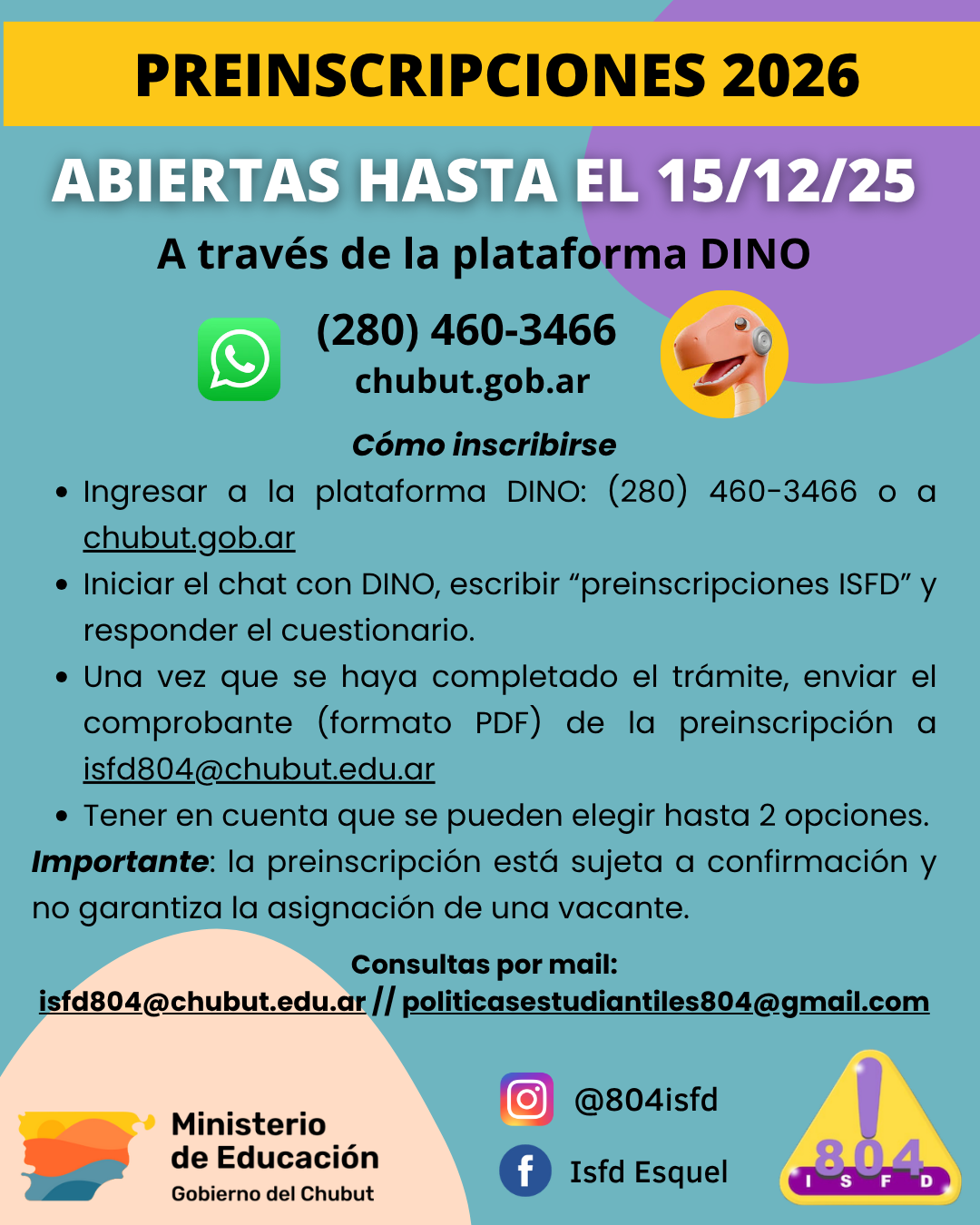 Consultas por mail: isfd804@chubut.edu.ar / politicasestudiantiles804@gmail.com